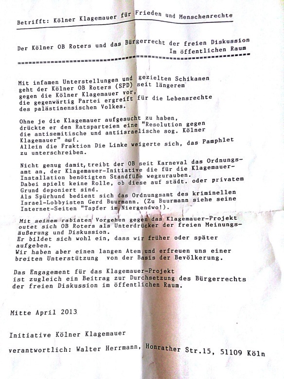 „Als Spürhund bedient sich das Ordnungsamt des kriminellen Israel-Lobbyisten Gerd Buurmann.“ (Ein ehemaliger Dauerdemonstrant vor dem Kölner Dom, April 2013)