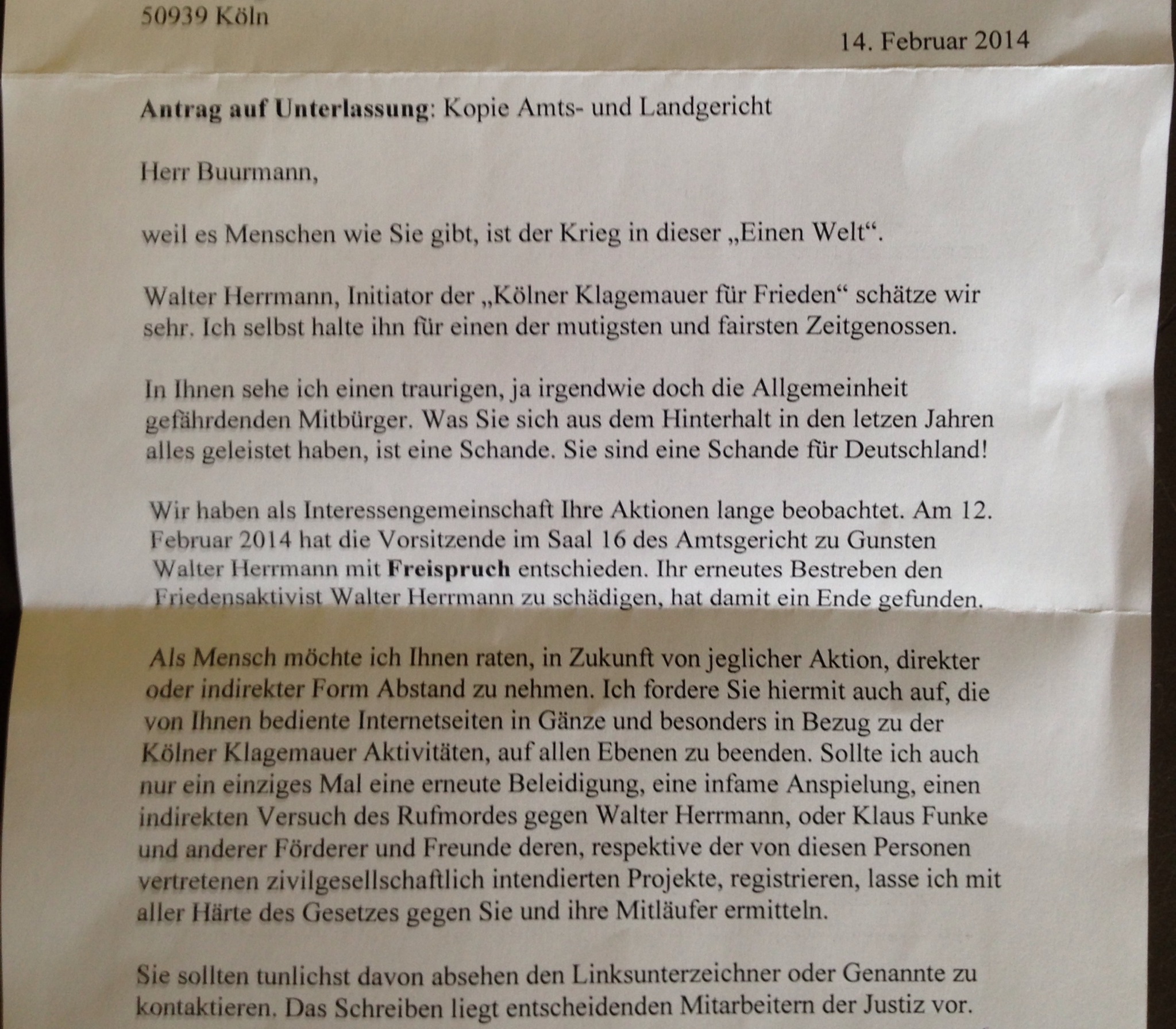 „Herr Buurmann, weil es Menschen wie Sie gibt, ist der Krieg in dieser „Einen Welt“. (…) In Ihnen sehe ich einen traurigen, irgendwie doch die Allgemeinheit gefährdenden Mitbürger. Was Sie sich aus dem Hinterhalt in den letzten Jahren alles geleistet haben, ist eine Schande. Sie sind eine Schande für Deutschland! (…) Sie sollten tunlichst davon absehen den Linksunterzeichner oder Genannte zu kontaktieren. Das Schreiben liegt entscheidenden Mitarbeitern der Justiz vor.“ (Ein Brief, 14. Februar 2014)