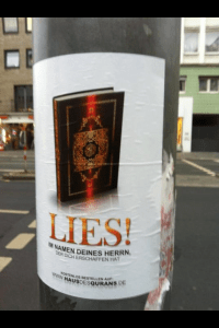 Im Gegenteil: Es gibt sogar einen guten Grund zum Lachen. Die Aktion nämlich, bei der einige Salafisten in Deutschland den Koran verteilen, läuft unter dem Motto „Lies!“ Mir ist schon klar, dass „Lies!“ der Imperativ von Lesen ist, aber „Lies“ bedeutet in unserer durch die englische Sprache stark beeinflussten Kultur eben auch „Lügen!“ Und dieses Motto „Lies!“ tragen jene Salafisten, die den Koran verteilen, auf ihren Hemden und T-Shirts. Und so kommt es, dass ein Salafist einen Koran in der Hand hält und dabei stolz ein Hemd trägt, auf dem „Lies!“ zu lesen ist: Lügen! Andere wiederum verteilen zu Koran Postkarten, auf denen „Lies!“ zu lesen ist: Lügen! Ganz harte hauen direkt ein Plakat raus, auf dem der Koran zu sehen ist und darunter ganz fett: „Lies!“ Auf einem Plakat steht sogar: „Jetzt kostenlos erhältlich: Lies!“ Köstlich.