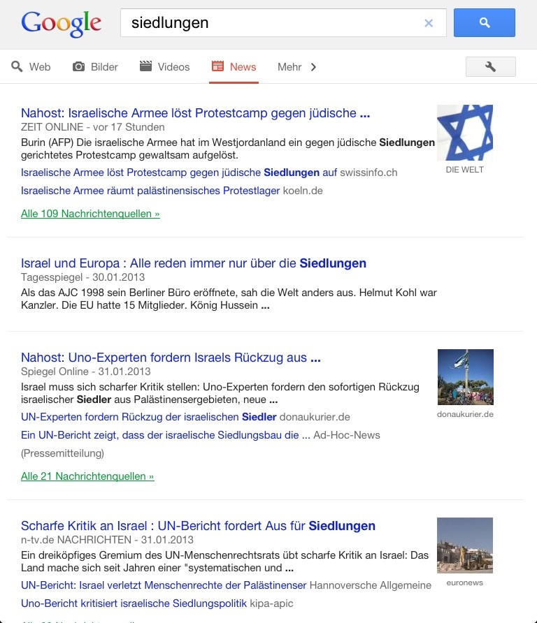 Wenn Sie eine gesonderte Suche für Nachrichten machen, bekommen Sie sogar fast ausschließlich Ergebnisse mit „jüdischen Siedlungen“.