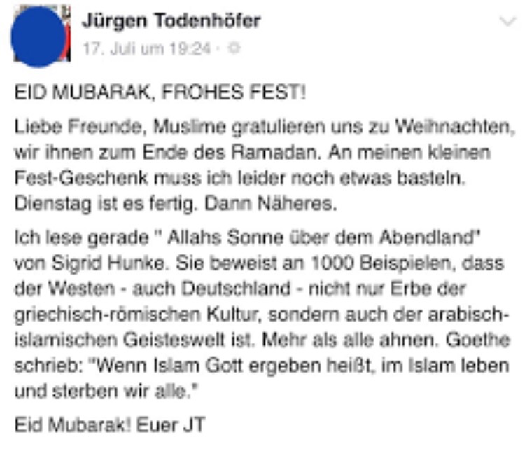 Auf seiner Facebook-Seite gratuliert Jürgen Todenhöfer zum Ende des Ramadans und empfiehlt zur Feier des Tages das Buch einer Nationalsozialistin: