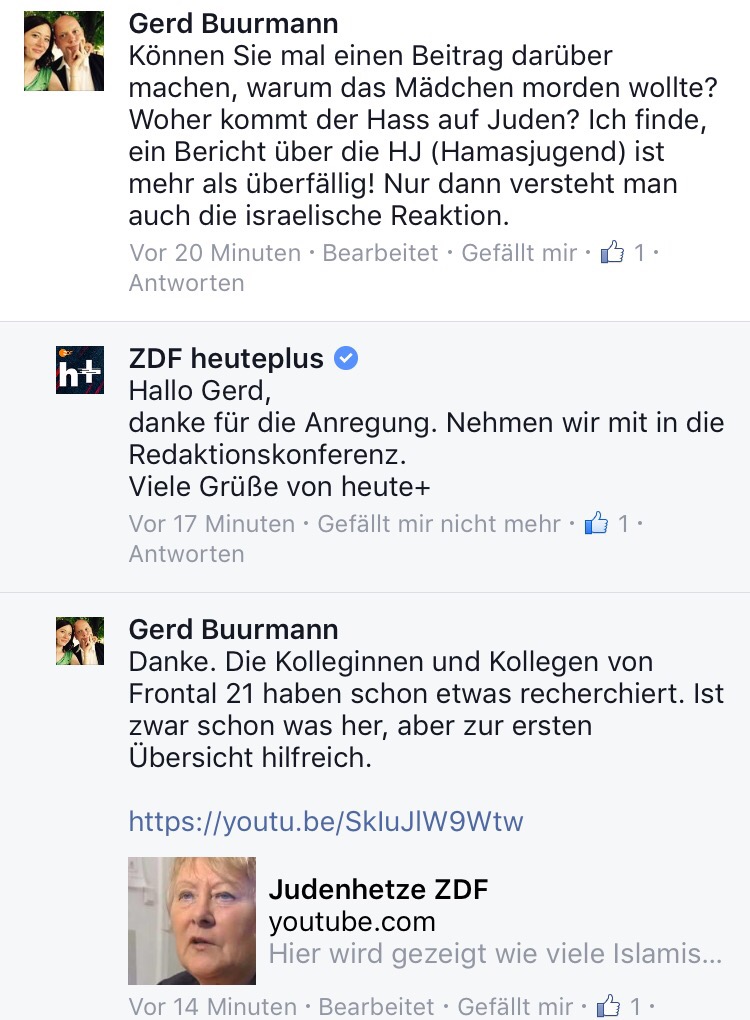 „Können Sie mal einen Beitrag darüber machen, warum das Mädchen morden wollte? Woher kommt der Hass auf Juden? Ich finde, ein Bericht über die HJ (Hamasjugend) ist mehr als überfällig! Nur dann versteht man auch die israelische Reaktion.“