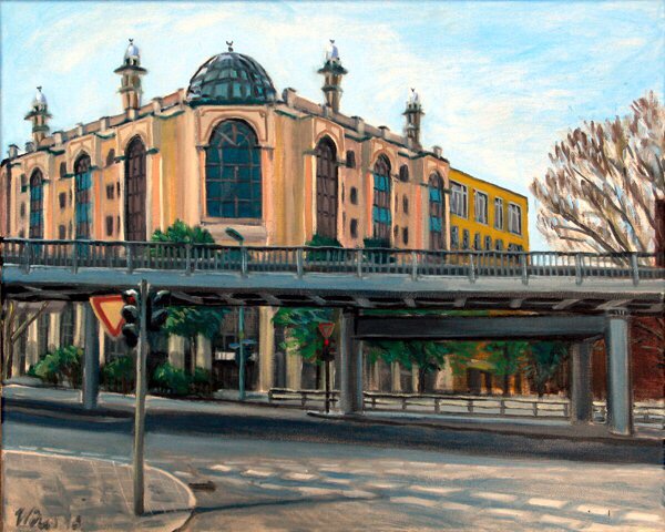 Dies ist ein Gemälde von William Wires. Es zeigt die Omar Ibn Al-Khuttab Moschee in Berlin-Kreuzberg in der unmittelbaren Nähe des Görlitzer Bahnhofs. Am 10. Juni 2016 radelte William Wires wieder einmal an diesem Ort vorbei, als er auf der Verkehrsinsel am Anfang der Wienerstraße einen wild gestikulierenden Mann mit Pappschildern sah. Er stieg von seinem Fahrrad ab und machte ein paar Bilder von dem Mann.