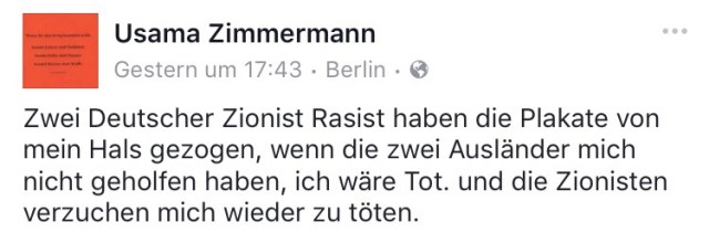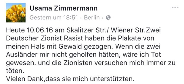 „Zwei Deutscher Zionist Rasist haben die Plakate von mein Hals gezogen, wenn die zwei Ausländer mich nicht geholfen haben, ich wäre Tot. und die Zionisten verzuchen mich wieder zu töten.“
