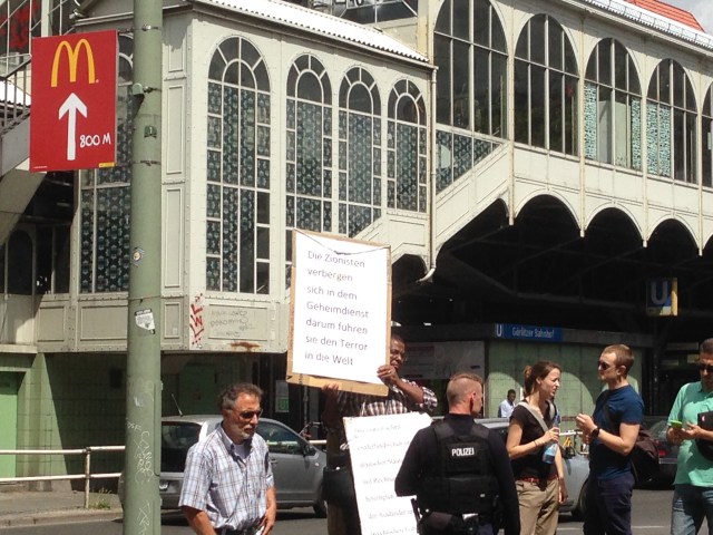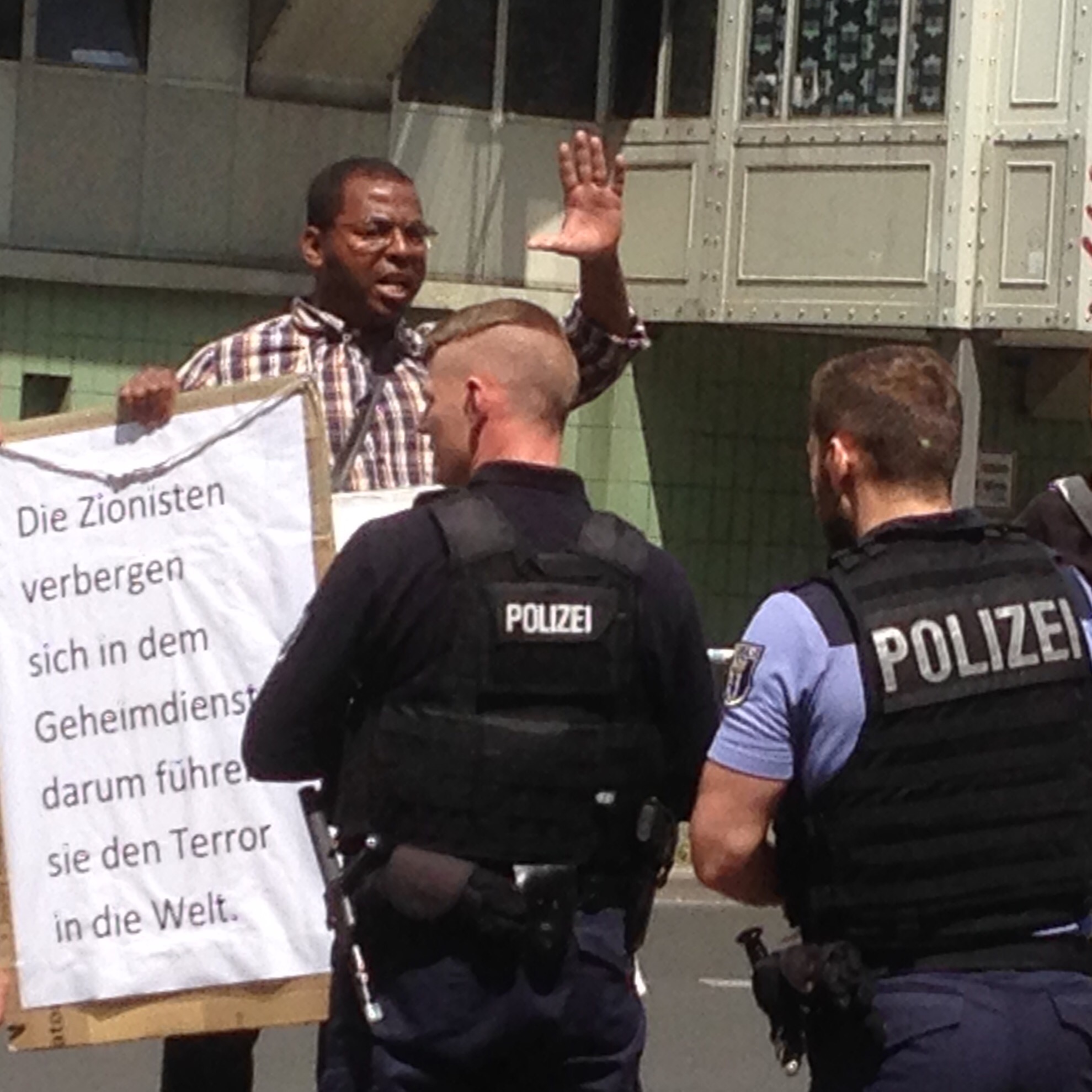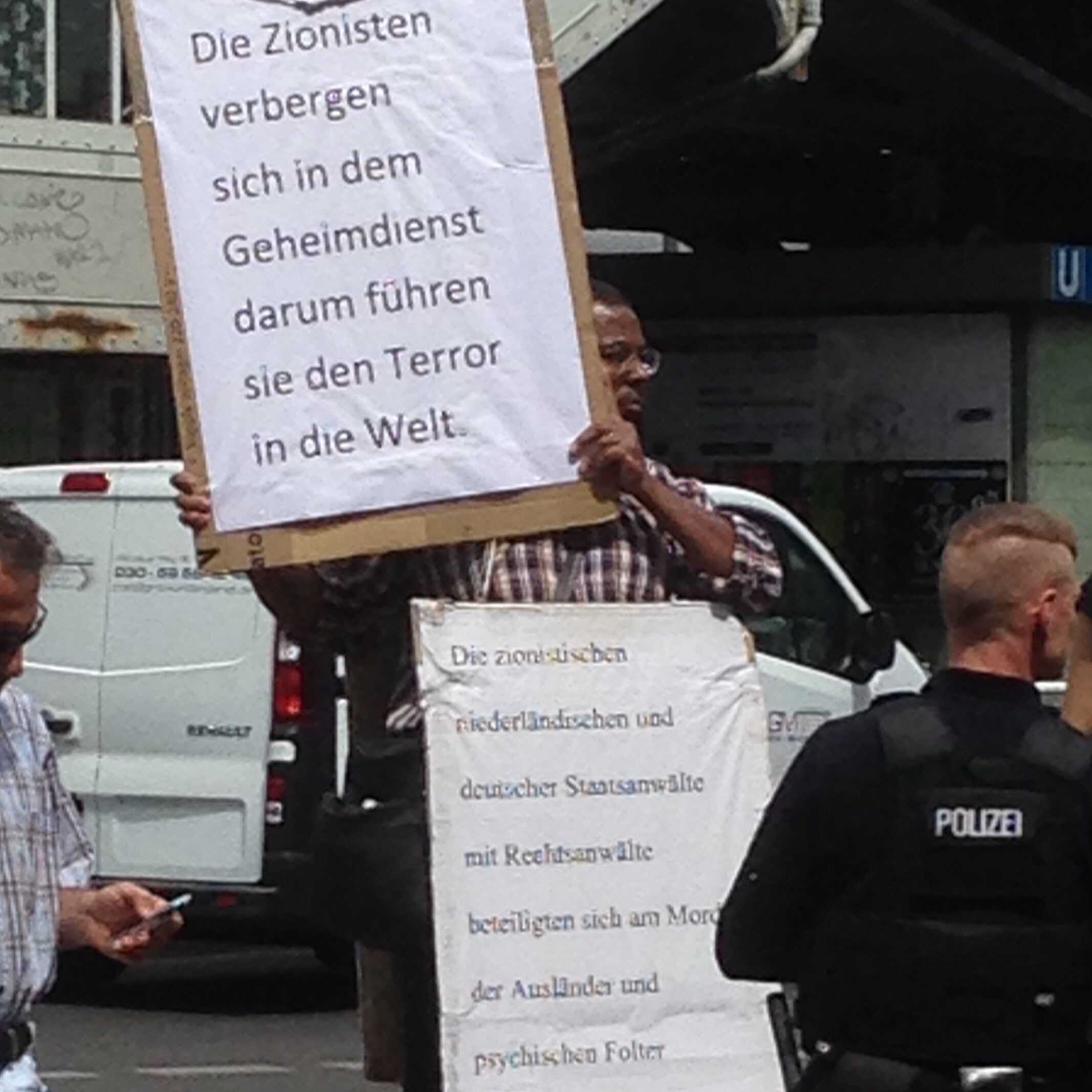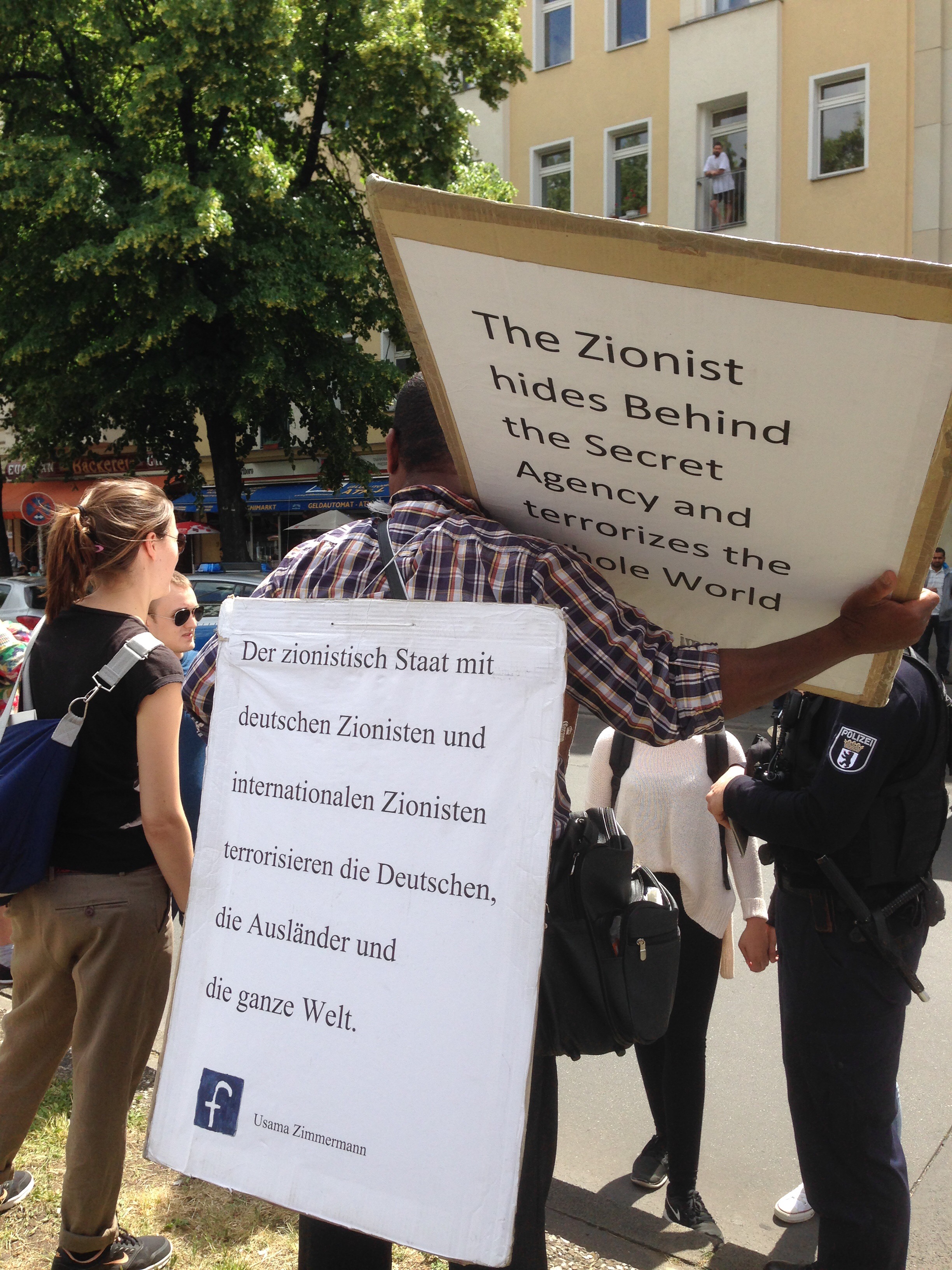 Laut einem Plakat heißt der Mann Usama Zimmermann. Auf einem anderen Plakat steht: „Die Zionisten verbergen sich in dem Geheimdienst, darum führen sie den Terror in die Welt.“