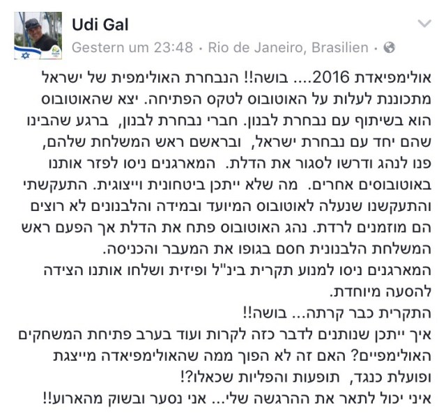 „Schande über die Olympischen Spiele 2016. Nach der Eröffnungszeremonie sollte die israelische Delegation einen Bus mit der libanesischen Delegation teilen. Als die libanesische Delegation dies bemerkte, verlangte sie von dem Fahrer, die Tür zum Bus geschlossen zu halten. Die Veranstalter versuchten daraufhin, uns auf verschiedene Busse zu zerstreuen.“