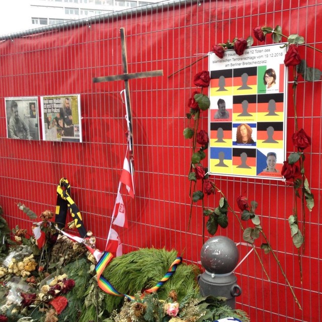Es ist ein nassgrauer Wintertag in Berlin und die Stadt zeigt sich von ihrer trübsten Seite. Als ich das behelfsmäßige Mal zum Andenken an die zwölf Toten vom Breitscheidplatz besuche, sehe ich dieses kleine Plakat, auf dem vier der Toten mit Gesicht identifiziert wurden und ein weiterer nur mit Namen angeführt wird.