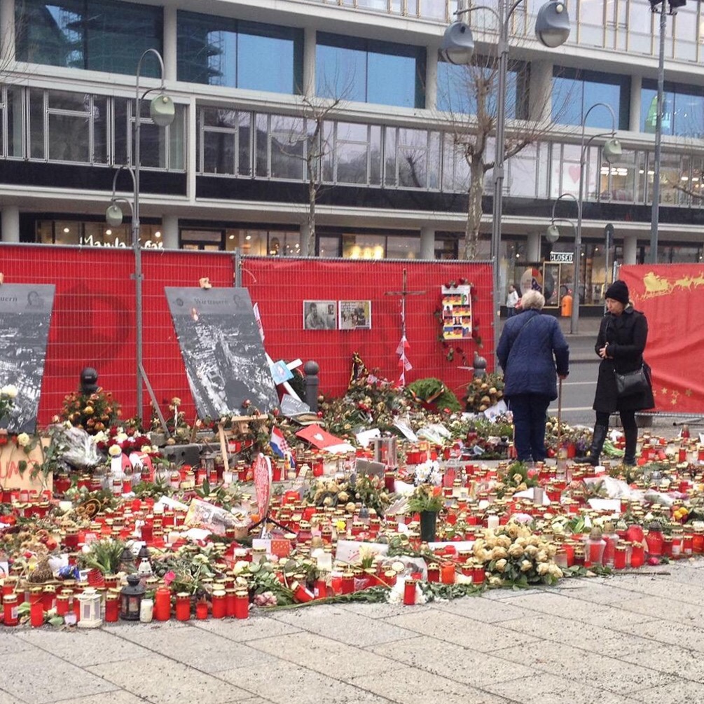 Es ist ein nassgrauer Wintertag in Berlin und die Stadt zeigt sich von ihrer trübsten Seite. Als ich das behelfsmäßige Mal zum Andenken an die zwölf Toten vom Breitscheidplatz besuche, sehe ich dieses kleine Plakat, auf dem vier der Toten mit Gesicht identifiziert wurden und ein weiterer nur mit Namen angeführt wird.