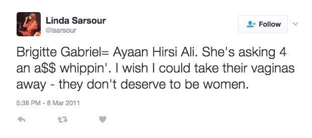 „Ayaan Hirsi Ali verlangt nach einem Arschtritt. Ich wünsche, ich könnte ihre Vagina wegnehmen. Sie verdient es nicht, eine Frau zu sein.“