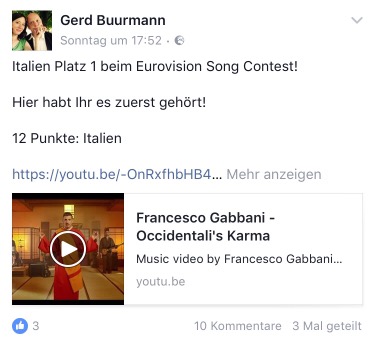 Im Jahr 2015 sagte Tapfer im Nirgendwo mit als erster Blog den Sieg Schwedens voraus und im Jahr 2016 legte ich mich früh auf die Ukraine fest. Auch in diesem Jahr darf mir vertraut werden. Italien wird beim Eurovision Song Contest 2017 gewinnen!