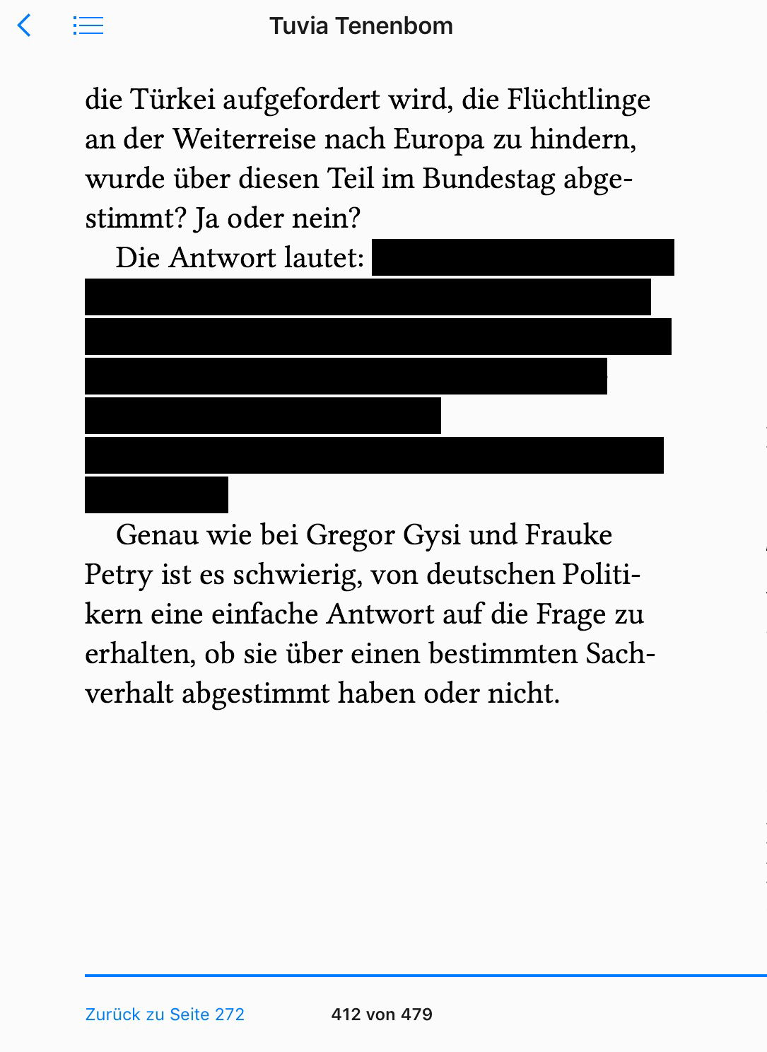 Tuvia versteht die Kunst des offenen Gesprächs. Allerdings traut sich nicht jeder Mensch mit ihm auf die hohe See der klaren Worten. In Kapitel 23 ist es zum Beispiel Henriette Reker, die sich windet, ja nicht das Falsche zu sagen. Sie weiß, wie schnell und gnadenlos man in Deutschland für eine reine Wortäußerung in Grund und Boden gestampft werden kann. Der Shitstorm, den ihre Armlängeaussage im Januar 2016 ausgelöst hatte, ist legendär. Volker Beck hat es vorgezogen, große Teile seines Gesprächs mit Tuvia Tenenbom komplett zurückzuziehen. Daher sind all seine Antworten im 22. Kapitel geschwärzt, was besonders schade ist, weil wir so nicht erfahren, ob über den Deal mit der Türkei in Sachen Flüchtlingspolitik überhaupt parlamentarisch abgestimmt wurde.