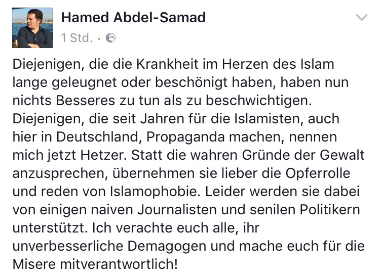 Hamed: Diejenigen, die die Krankheit im Herzen des Islam lange geleugnet oder beschönigt haben, haben nun nichts Besseres zu tun als zu beschwichtigen. Diejenigen, die seit Jahren für die Islamisten, auch hier in Deutschland, Propaganda machen, nennen mich jetzt Hetzer. Statt die wahren Gründe der Gewalt anzusprechen, übernehmen sie lieber die Opferrolle und reden von Islamophobie. Leider werden sie dabei von einigen naiven Journalisten und senilen Politikern unterstützt. Ich verachte euch alle, ihr unverbesserliche Demagogen und mache euch für die Misere mitverantwortlich!