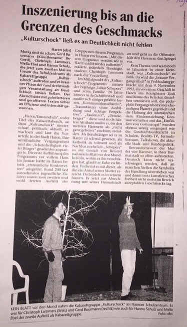 „Mutig sind sie schon, Gerd Buurmann, Christoph Lammers, Mella Ebel und Hanno Schulz, die jetzt zum zweiten Mal im Forum des Schulzentrums als Kabarettgruppe ‚Kulturschock‘ auftraten und es in keiner der rund dreistündigen Veranstaltung an Deutlichkeit fehlen ließen. (…) Kein Thema, und sei es noch so tabuisiert in einer Kleinstadt, war ‚Kulturschock‘ zu heiß. Da wird die ‚braune Vergangenheit‘ in Verbindung gebracht mit dem 9. November 1992 als vor einem Geschäft in Haren ein Reisigbesen Sinti und Roma das Betreten desselben vermiesen soll, die pädophile Vergangenheit eines ehemaligen Pastors gegeißelt und die Haltung der Amtskirchen dazu. Kindererziehung, Konsumverhalten und das ‚Einflößen von Gottesangst‘ wurden ebensowenig ausgespart wie der Geschichtsunterricht in Schulen, Reality-TV, Fernsehkonsum, Talkshows, die aktuelle Stadt- und Bundespolitik. Bewundernswert der Mut der vier Harener, in ihrer Heimatstadt so offen aufzutreten. Dennoch kann nicht verschwiegen werden, daß an manchen Stellen die Symbolik der Handlung übertrieben war und damit trotz künstlerischer Freiheit nicht mehr im Bereich akzeptablen Geschmacks lag.“