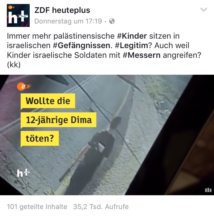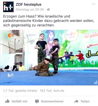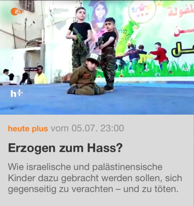 Anfang Juli 2016 behauptete das Magazin ZDF heute+, jüdische Kinder in Israel würden dazu erzogen, Palästinenser zu töten.