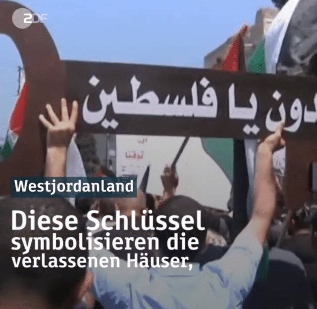 Ja, die Schlüssel symbolisieren die verlassenen Häuser; sie wurden jedoch bewusst verlassen, um der Vernichtung von Juden nicht im Wege zu stehen. Was ist eigentlich mit den Schlüsseln all der 850.000 Juden, die tatsächlich vertrieben wurden? Die zeigt das ZDF nicht. Neutralität und Objektivität scheint in der öffentlich-rechtlichen Anstalt nicht gefragt zu sein. Ich stellte daher dem ZDF die Frage: „Wie kommen das ZDF dazu, von vertriebenen Palästinensern zu sprechen? Bitte erklären Sie Ihre Wortwahl, denn entweder stimmt mein Geschichtsbuch nicht oder Sie haben eine Lüge über Israel verbreitet. Dann aber frage ich: Warum?“