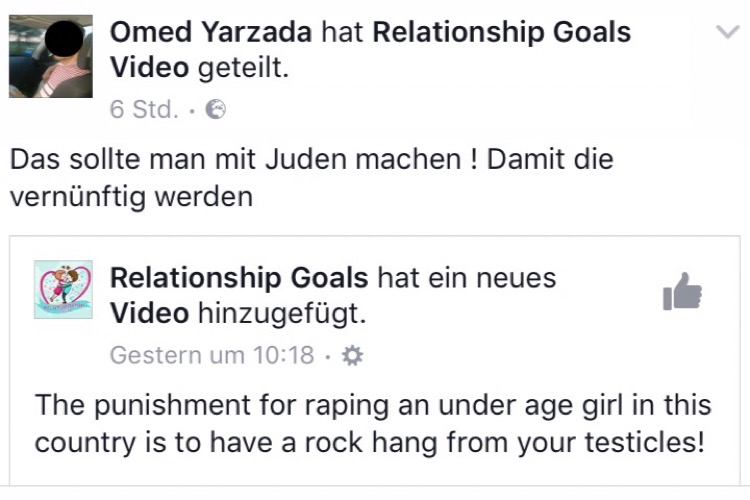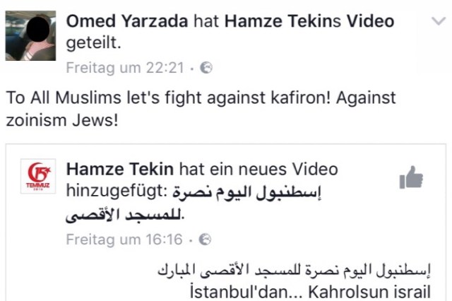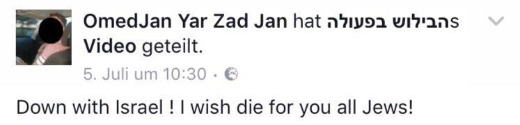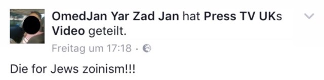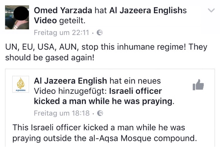 Auf seiner Facebookseite erklärt er ebenfalls, dass alle Muslime gegen israelische Zionisten kämpfen sollten, dass man Juden foltern sollte, indem man ihnen schwere Steine an die Hoden bindet und dass Israelis „wieder vergast“ werden sollten und „in die Gaskammern“ gehören.