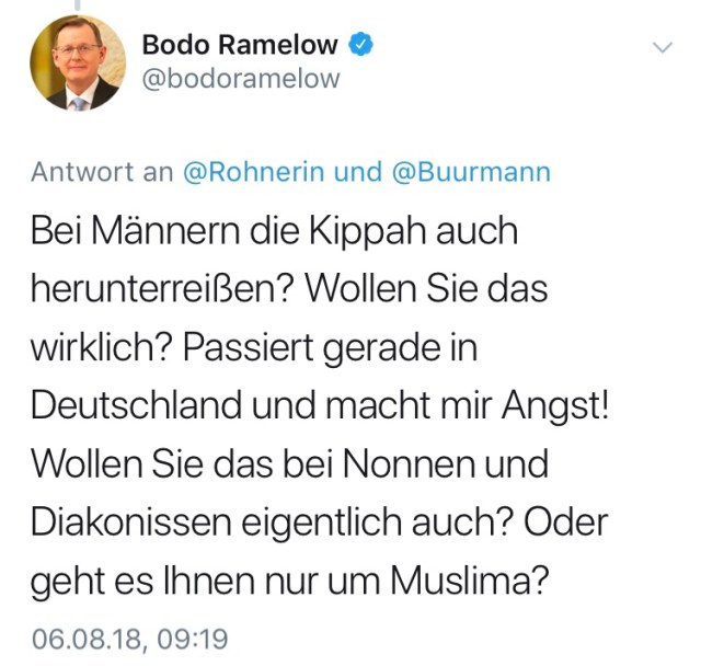 „Bei Männern die Kippah auch herunterreißen? Wollen Sie das wirklich? Passiert gerade in Deutschland und macht mir Angst! Wollen Sie das bei Nonnen und Diakonissen eigentlich auch? Oder geht es Ihnen nur um Muslima?“