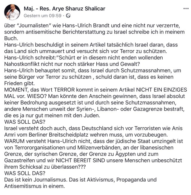 Je häufiger Herr Brandt in diesem Stil schreibt, um so eifriger werden seine Texte gelesen. Und sie werden sehr wohl verstanden, wie der aktuelle Facebookkommentar von Arye Shalicar zeigt, der ihren Artikel in gewohnter Klarheit kommentiert:
