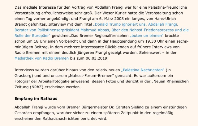 Auch der von Herrn Brandt immer wieder (hier, hier und hier) begeistert promotete Abdallah Frangi erinnert uns ja gerne an das, was wichtig ist. Zusammen mit Herrn Brandt teilt er die Ansicht, dass man auch die USA in einem bestimmten Licht sehen sollte. Dass auch unser Bürgermeister dieser Sicht der Dinge nicht abgeneigt ist, der „beliebteste“ Bürgermeister Deutschlands, wie wir wissen und man von Bremen aus dann gerne ins Überseemuseum und ins Rathaus einlädt, erfreut ja insbesondere die Fraktion der Palästinafreunde, die während des kurzen Intermezzos von Daniel Killy im Weserkurier nicht so viel zu lachen hatten.
