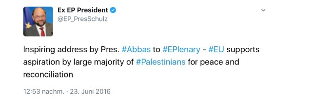 Am 23. Juni 2016 war Mahmud Abbas zu Gast im Parlament der Europäischen Union. Er nutzte seine Rede, um zu schauen, wie sehr er die rote Linie nach vorne verschieben konnte. Er verbreitete offen im Parlament die aus dem Mittelalter bekannte Lüge vom brunnenvergiftenden Juden. Er behauptete, es gäbe gewisse Rabbiner, die beauftragt hätten, Brunnen zu vergiften.
