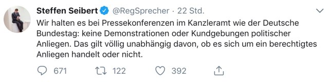 „Wir halten es bei Pressekonferenzen im Kanzleramt wie der Deutsche Bundestag: keine Demonstrationen oder Kundgebungen politischer Anliegen. Das gilt völlig unabhängig davon, ob es sich um ein berechtigtes Anliegen handelt oder nicht.„