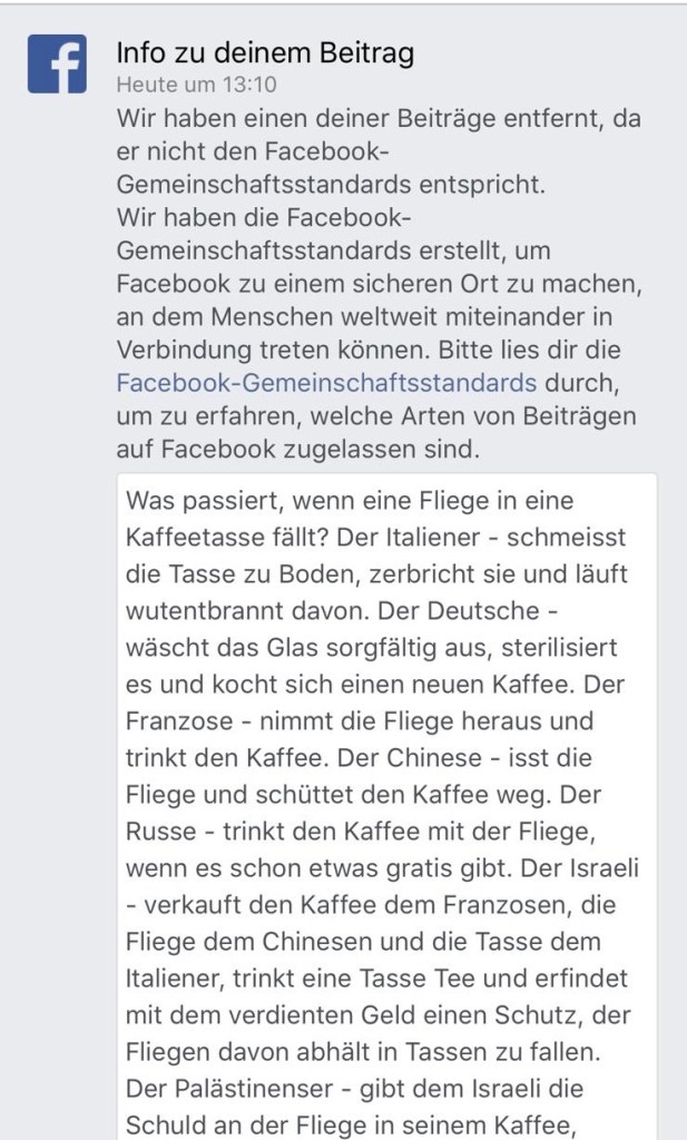 Es gibt ein grundlegendes Problem bei Facebook. Dort werden Einträge gelöscht, wenn sie von vielen Menschen gemeldet werden. Diese Methode hat jedoch einen großen Fehler. Es gibt über 2,1 Milliarden Christen und über 1,6 Milliarden Muslime auf der Welt. Aber es gibt nicht mal 16 Millionen Juden. Es ist viel leichter, eine große Anzahl von Muslimen oder Christen zu finden, die sich durch eine Aussage beleidigt fühlen und mag sie auch noch so harmlos sein, als eine große Anzahl von Juden, die sich durch eine Aussage beleidigt fühlen und mag sie auch noch so brutal sein.