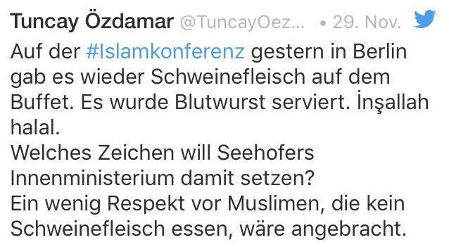 „Auf der Islamkonferenz gestern in Berlin gab es wieder Schweinefleisch auf dem Buffet. Es wurde Blutwurst serviert. Inşallah halal. Welches Zeichen will Seehofers Innenministerium damit setzen? Ein wenig Respekt von Muslimen, die kein Schweinefleisch essen, wäre angebracht.“