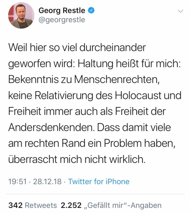 Georg Restle schrieb, das Bekenntnis zu den Menschenrechten und die Erklärung, den Holocaust nicht zu relativieren, seien Haltungen. Man kann natürlich in diesen Fällen von „Haltungen“ sprechen, ich spreche jedoch lieber von Selbstverständlichkeiten.