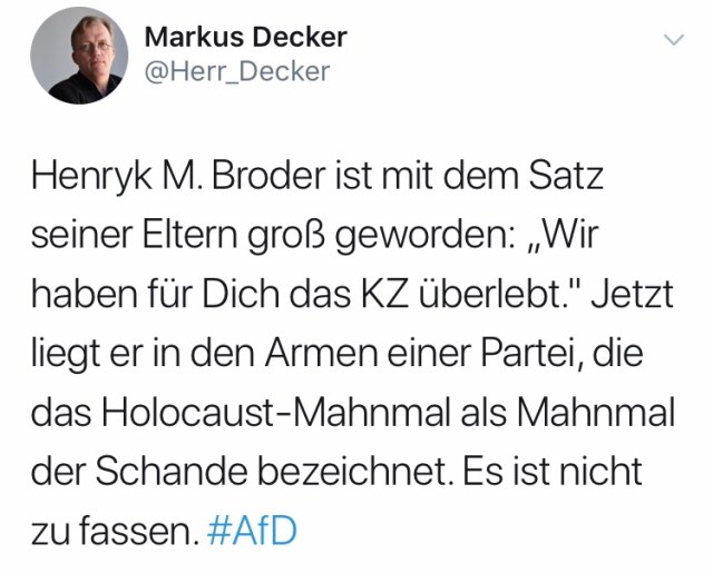 „Henryk M. Broder ist mit dem Satz seiner Eltern groß geworden: „Wir haben für Dich das KZ überlebt.“ Jetzt liegt er in den Armen einer Partei, die das Holocaust-Mahnmal als Mahnmal der Schande bezeichnet. Es ist nicht zu fassen.“