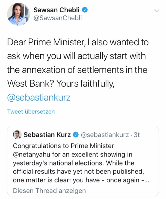 Die SPD schwieg auch, als Sawsan Chebli auf den österreichischen Kanzler reagierte, nachdem jener den amtierenden Premierminister Israels zu einer erfolgreichen, demokratischen Wahl gratuliert hatte. Sie nutzte ihre Zeilen, um Israel zu kritisieren.