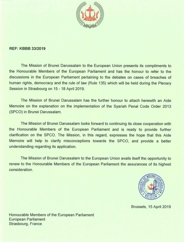 Das Sultanat Brunei in Südostasien hat die Todesstrafe für Homosexualität eingeführt. Am 15. April 2019 schrieb die Gesandtschaft von Brunei einen Brief der Erläuterung an die Mitglieder des Europäischen Parlaments in Straßburg. Tapfer im Nirgendwo präsentiert diesen Brief in Übersetzung. Was Sie gleich lesen werden, wird Ihnen die Sprache verschlagen. Was immer Sie bisher über den Islam, die Vereinten Nationen oder die Menschenrechte geglaubt haben, dieser Brief wird Sie erschüttern.