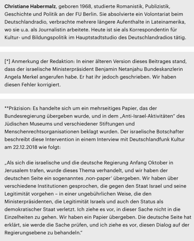 Präzision: Es handelte sich um ein mehrseitiges Papier, das der Bundesregierung übergeben wurde, und in dem „Anti-Israel-Aktivitäten“ des Jüdischen Museums und verschiedener Stiftungen und Menschenrechtsorganisationen beklagt wurden. Der israelische Botschafter beschreibt diese Intervention in einem Interview mit Deutschlandfunk Kultur am 22.12.2018 wie folgt: