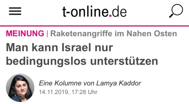 In einer Kolumne für t-online.de hat Lamya Kaddor erklärt, man könne Israel nur „bedingungslos unterstützen“.