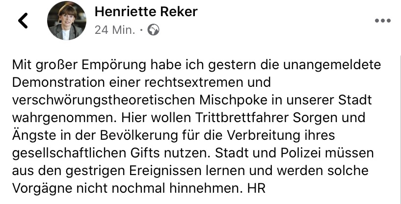 Am 10. Mai 2020 veröffentlichte die Oberbürgermeisterin von Köln, Henriette Reker, folgende Nachricht: