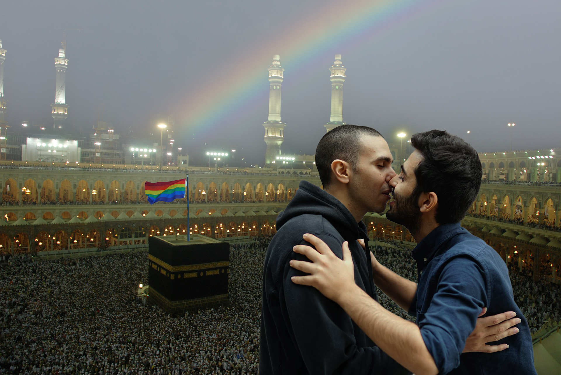 Diese Worte stammen von Amed Sherwan. Er lebt in Flensburg und hat eine Fotocollage auf Facebook hochgeladen, auf der er zu sehen ist, wie er einen Mann küsst, während im Hintergrund die Kaaba in Mekka zu sehen ist, auf der eine Regenbogenfahne weht, während sich im Horizont vor Minaretten ein Regenbogen spannt.