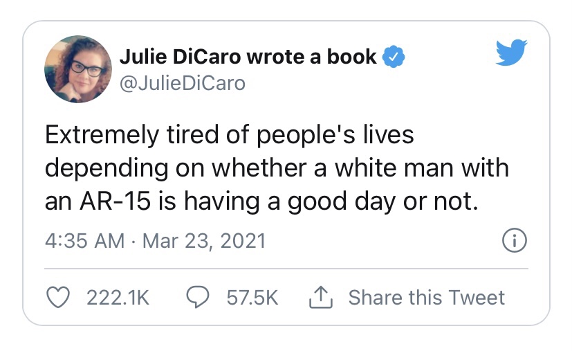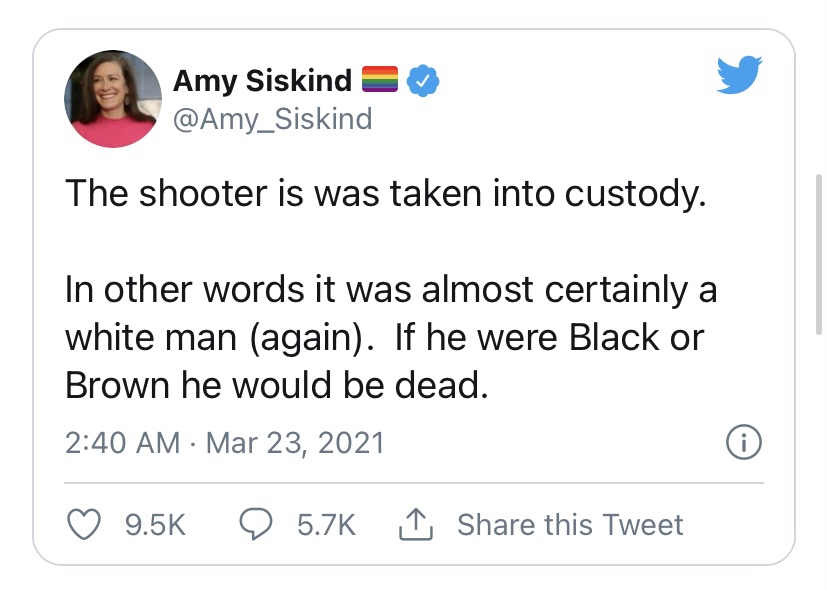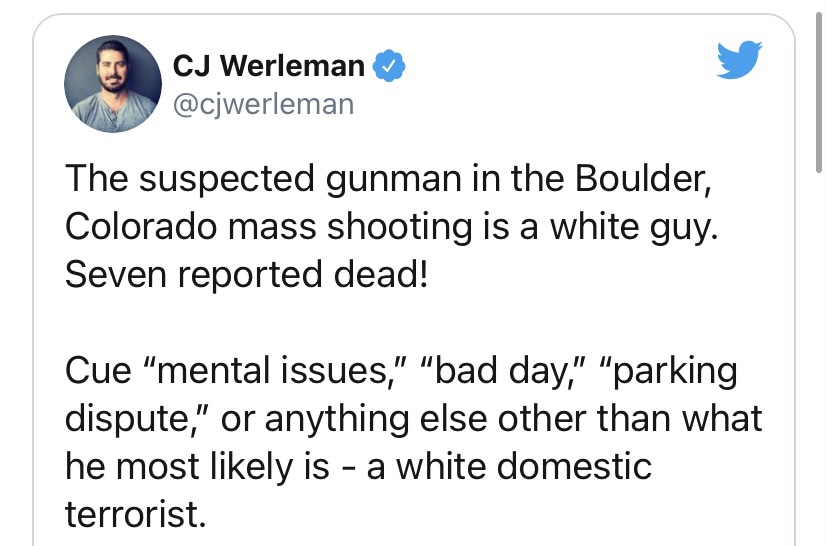 Der Täter von Atlanta erklärt offen, seine Tat aus religiösen Gründen begangen zu haben. Auch der Täter von Boulder hatte Überzeugungen, die er offen auf seinem Profil auf Facebook artikulierte. Statt aber zu schauen, was der Täter selbst erklärt, wurde bei CNN und in anderen Medien über die Hautfarbe des Täters spekuliert. Es wurde sogar teilweise wahrheitswidrig behauptet, der Täter sei „weiß“ gewesen, wie es zum Beispiel CJ Werkeman von Byline Times auf Twitter tat: