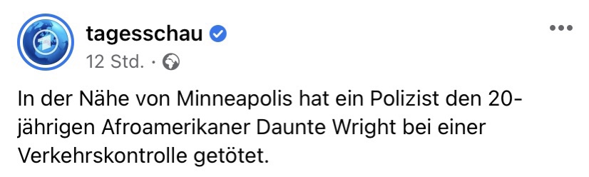 „In der Nähe von Minneapolis hat ein Polizist den 20-jährigen Afroamerikaner Daunte Wright bei einer Verkehrskontrolle getötet.“