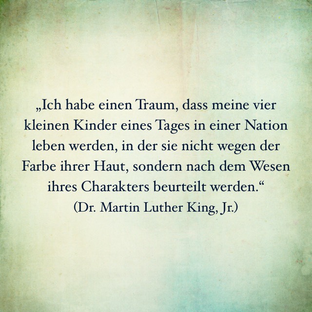 „Ich habe einen Traum, dass meine vier kleinen Kinder eines Tages in einer Nation leben werden, in der sie nicht wegen der Farbe ihrer Haut, sondern nach dem Wesen ihres Charakters beurteilt werden.“