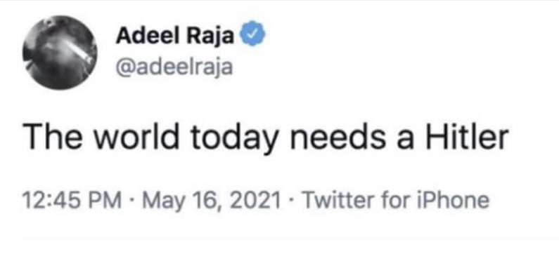 Im Mai 2021 erklärte Adeel Raja: „Die heutige Welt braucht einen Hitler“.
