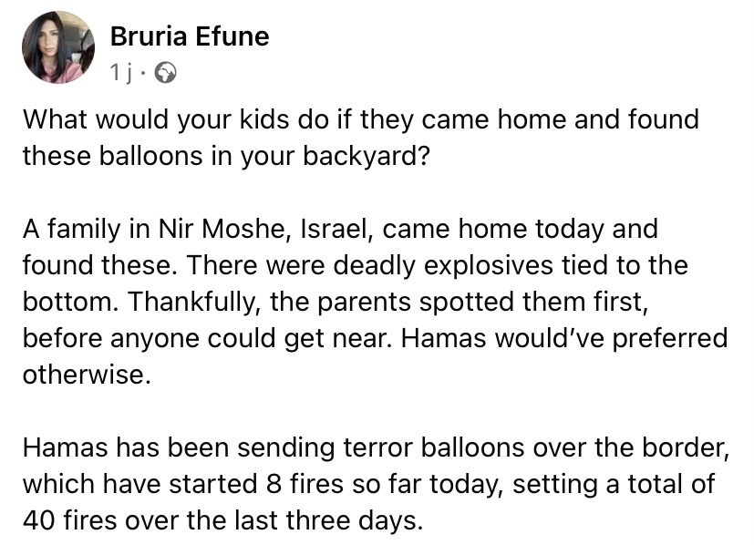 Eine Familie in Nir Moshe in Israel kam im Juni 2021 nach Hause und fand diese Ballons im Garten. Am unteren Ende war tödlicher Sprengstoff befestigt. Zum Glück entdeckten die Eltern die Ballons, bevor sich die Kinder nähern konnten. Bruria Efune betont, die Hamas hätte es es bevorzugt, wenn die Kinder die Ballons gefunden hätten: