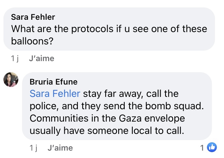 In der Kommentarspalte fragt eine Frau Bruria Efune, wie man sich in so einem Fall verhalten solle und bekommt folgende Empfehlung: „Bleiben Sie weit weg und rufen Sie die Polizei. Die schickt das Bombenkommando. Die Gemeinden in der Umgebung des Gazastreifens haben normalerweise jemanden für diese Fälle vor Ort.“