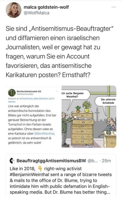 Auf Ihren Austausch mit einem Twitter-Account, das eine antisemitische Karikatur gepostet hat, auf dem nicht nur der israelische Journalist Benjamin Weinthal als „unterste Schublade“ bezeichnet wurde, sondern auch ein Schuh mit israelischer Flagge abgebildet war und symbolisierte, dass offenbar nicht nur Weinthal, sondern auch Israel für den Zeichner „unterste Schublade“ ist, von Weinthal angesprochen, haben Sie als Antisemitismus-Beauftragter nicht etwa die Karikatur kritisiert, sondern den jüdischen Journalisten als „right-wing-activist“ diffamiert. Eine Antwort auf seine Frage blieben Sie dem Journalisten schuldig.