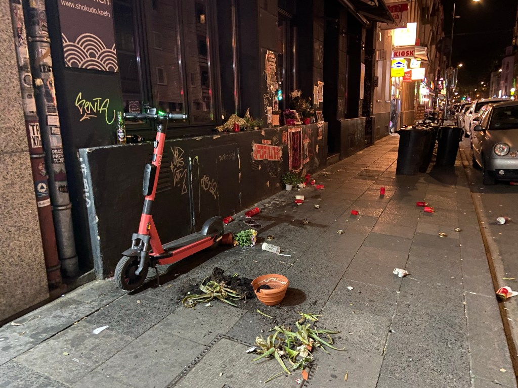 Nachtrag: Es dauerte nur ein paar Tage und schon war die Gedenkstätte für den 18-jährigen Jungen, der im Kwartier Latäng ermordet wurde, ebenso verwahrlost wie der Rest des Veedels.
