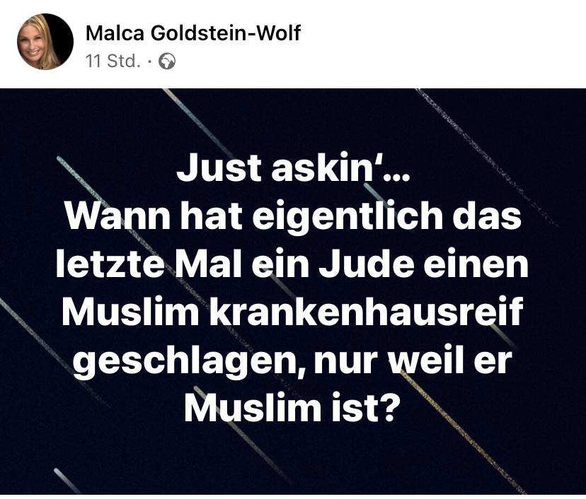 Malca Goldstein-Wolf fragt: „Wann hat eigentlich das letzte Mal ein Jude einen Muslim krankenhausreif geschlagen, nur weil er Muslim ist?“