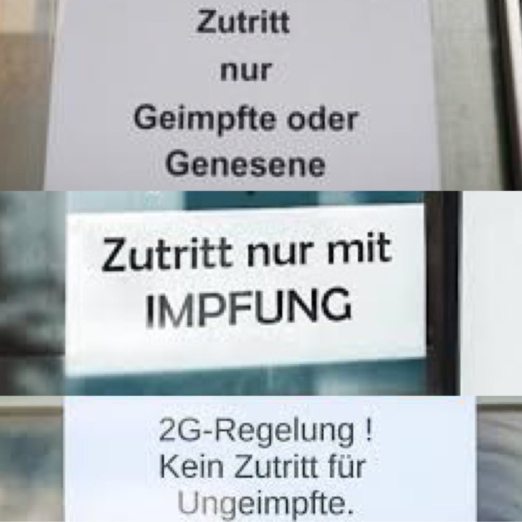 Es ist nicht falsch, weil wir endlich wieder unser altes Leben zurückhaben wollen, es ist auch nicht falsch, weil wir uns sicher fühlen wollen; es ist falsch, weil wir nicht zurückkehren in unser altes Leben, sondern weil wir in ein neues Leben hineingeschlittert sind, das nur scheinbar sicher ist, aber dafür umso ausgrenzender und unmenschlicher. In der schönen, neuen Welt, in der wir uns nun befinden, werden Nachbarn, Freunde und Familienmitglieder ausgegrenzt, weil sie nicht geimpft sind. An immer mehr Orten hängen Schilder an den Eingängen: „Eintritt nur für Geimpfte“ / „Kein Zutritt für Ungeimpfte“