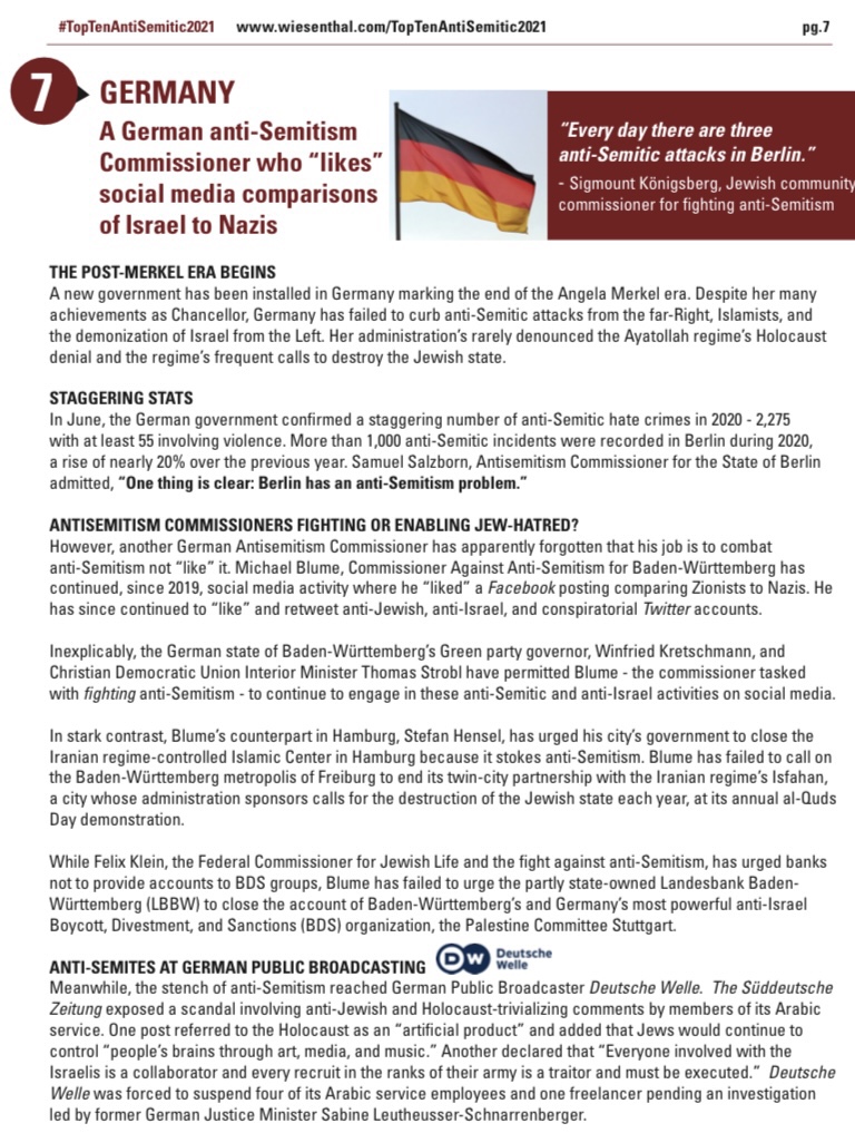 Das Simon Wiesenthal Center hat zum Ende des Jahres 2021 eine Antisemiten-Liste unter dem Titel „GLOBAL ANTI-SEMITISM 2021 TOP TEN“ herausgebracht. Auf Platz 7 findet sich Deutschland.