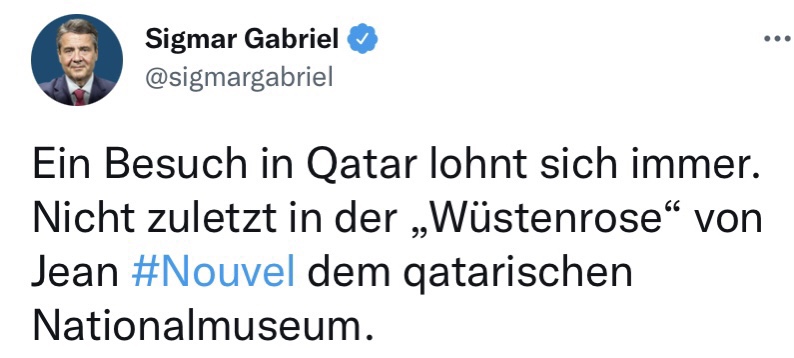Am 16. Januar 2022 um 23:07 Uhr veröffentlichte Ex-Vizekanzler Sigmar Gabriel (SPD) auf Twitter: „Ein Besuch in Qatar lohnt sich immer. Nicht zuletzt in der „Wüstenrose“ von Jean #Nouvel dem qatarischen Nationalmuseum.“