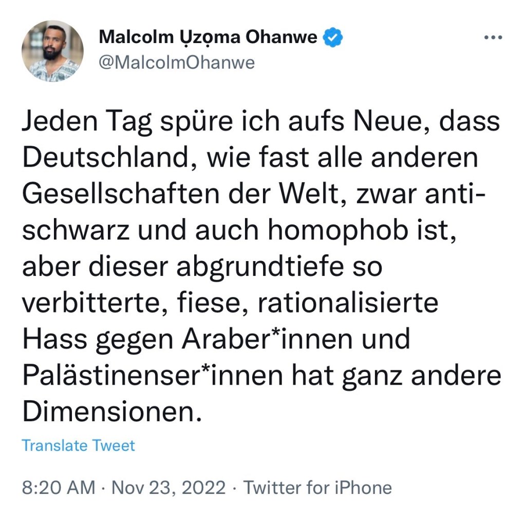 „Jeden Tag spüre ich aufs Neue, dass Deutschland, wie fast alle anderen Gesellschaften der Welt, zwar anti-schwarz und homophob ist, aber dieser abgrundtiefe so verbitterte, fiese, rationalisierte Hass gegen Araber*innen und Palästinenser*innen hat ganz andere Dimensionen.“