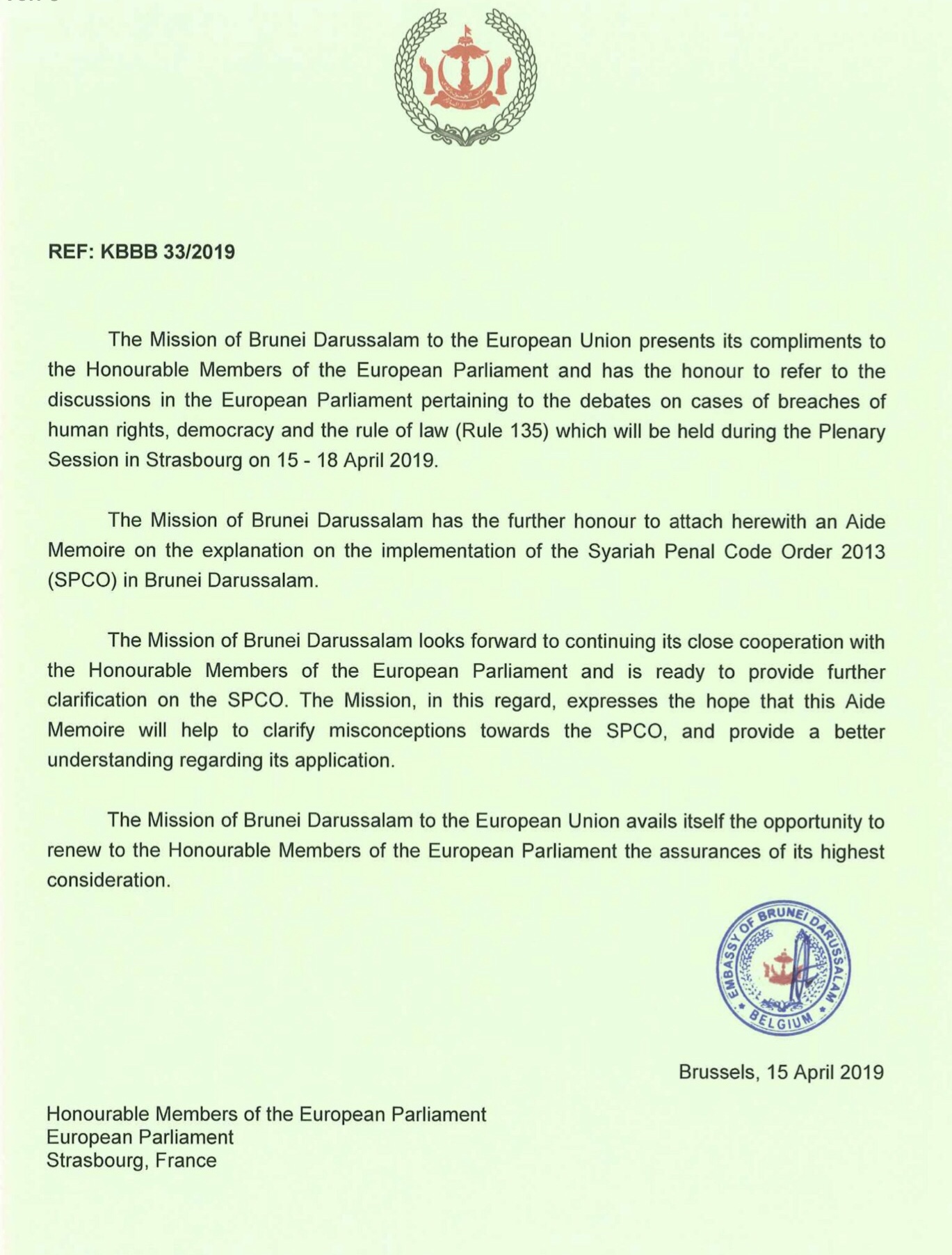 Brunei, Heimat des Friedens, bekräftigt sein Zusage zu den internationalen Verpflichtungen, die Menschenrechte zu fördern und zu schützen, wo wie sie in der Charta der Vereinten Nationen und in der universellen Erklärung der Menschenrechte verankert sind. Als ein verantwortungsbewusstes Mitglied der internationalen Gemeinschaft wird Brunei, Heimat des Friedens, weiterhin an seinen Verpflichtungen festhalten und sich an die internationale Abkommen zu Menschenrechten halten, an denen Brunei, Heimat des Friedens, Anteil hat. Dies beinhaltet das Abkommen zur Abschaffung jeglicher Form von Diskriminierung gegen Frauen. Die Unterschrift von Brunei, Heimat des Friedens, unter dem Abkommen der Vereinten Nationen gegen Folter und anderen brutalen, unmenschlichen und entwürdigenden Behandlungen und Bestrafungen aus dem Jahre 2015 ist Zeichen unserer starken Ablehnung von Taten der Folter. Schließlich, in unserer Anstrengung, unseren Einsatz zu demonstrieren, arbeitet Brunei, Heimat des Friedens, zur Zeit daran, die nötigen Schritte voranzutreiben, um eine schnelle Realisierung des Abkommens aus dem Jahre 2015 zu ermöglichen.“