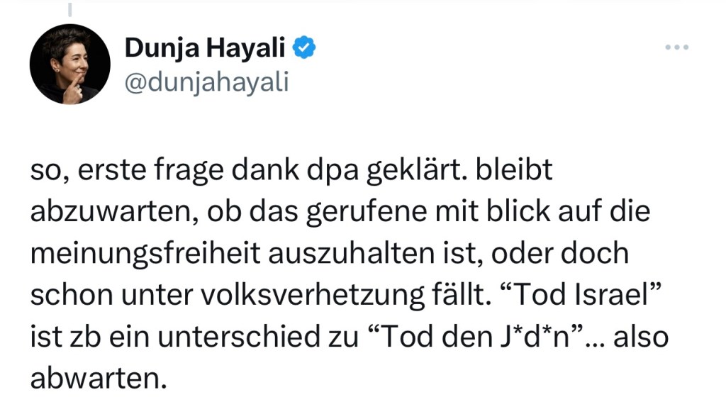 Für die Kölner Staatsanwaltschaft bestand im Jahr 2010 der Unterschied zwischen dem Hass auf Juden und dem Hass auf Israel in einer Krummnase. Für Dunja Hayali besteht im Jahr 2023 der Unterschied darin, dass sie Israel ausschreibt, Jude aber nicht: